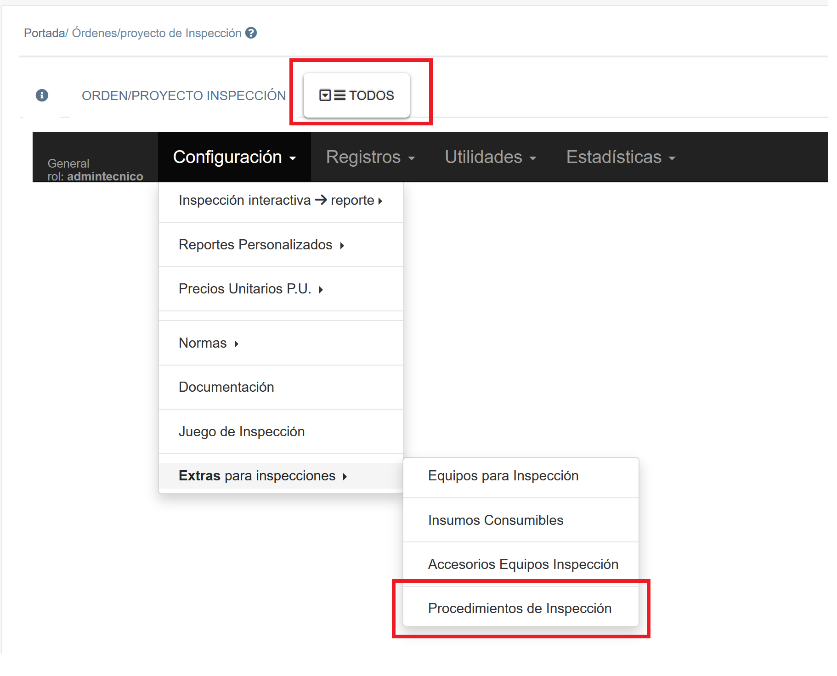 Para generar seleccionar TODOS Configuración Extras para inspecciones Procedimientos de inspección.