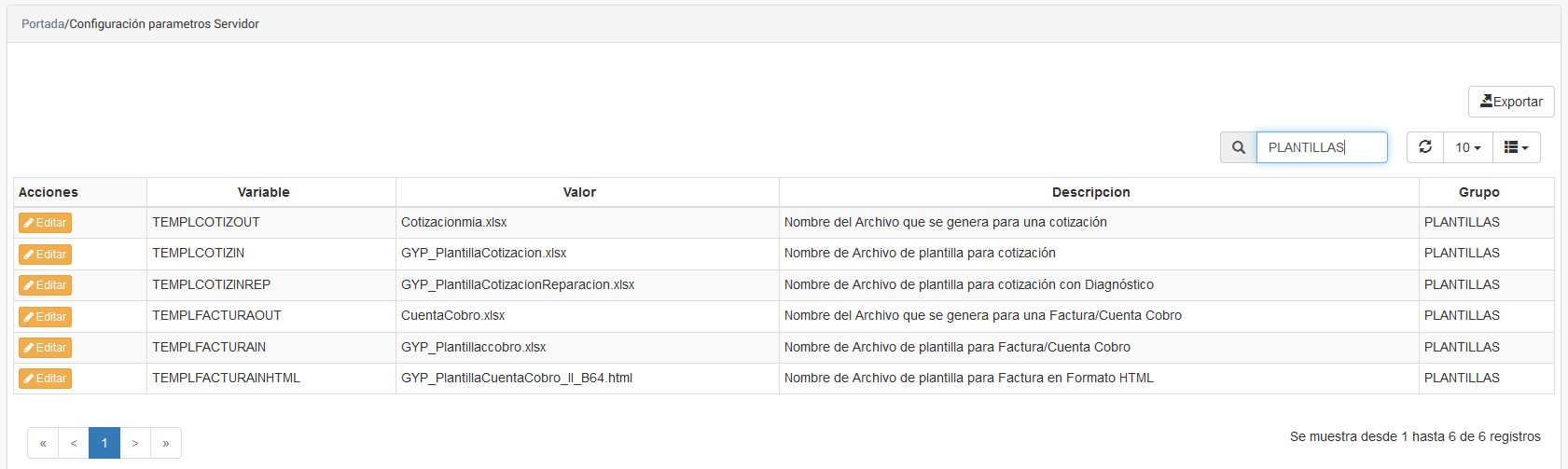 Al seleccionar la opción Configuración/Variables del Sistema aparecerá la siguiente imagen.