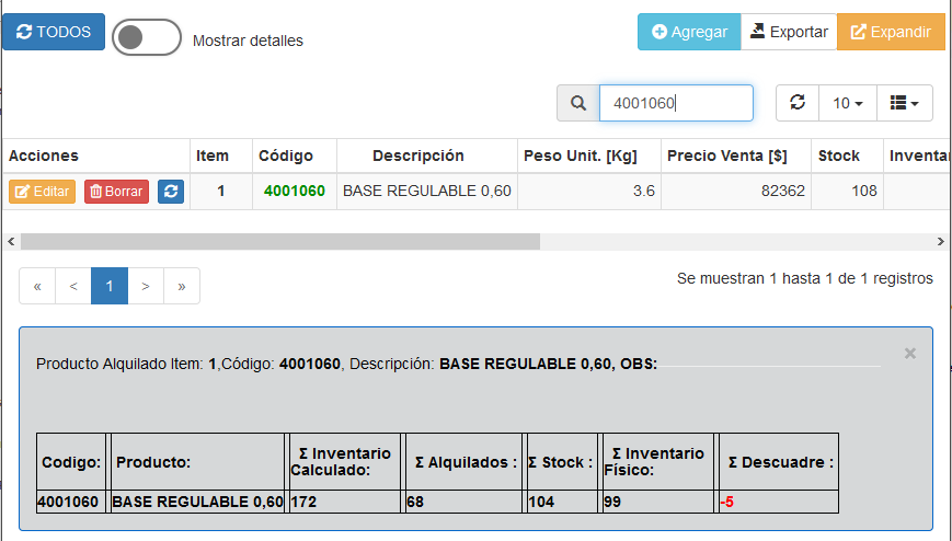 Del Listado de la figura anterior, en caso de presionar el botón EDITAR (Editar detalle de Producto alquilado), aparecerá una ventana emergente con el detalle de los elementos que la contengan (más detalles Agregar/Editar nuevo Producto en Alquiler) el valor se muestra tal como se indica en la siguiente imagen.