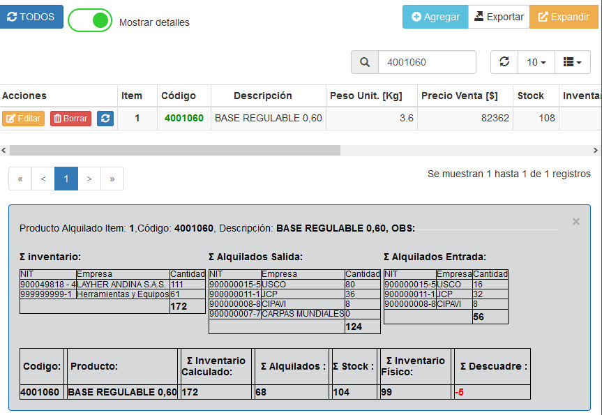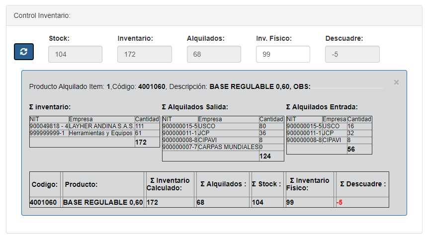 Con base a valores de Inventario ingresado e históricos de movimientos de Alquiler de Entradas y Salidas se realiza el cálculo para cada producto.