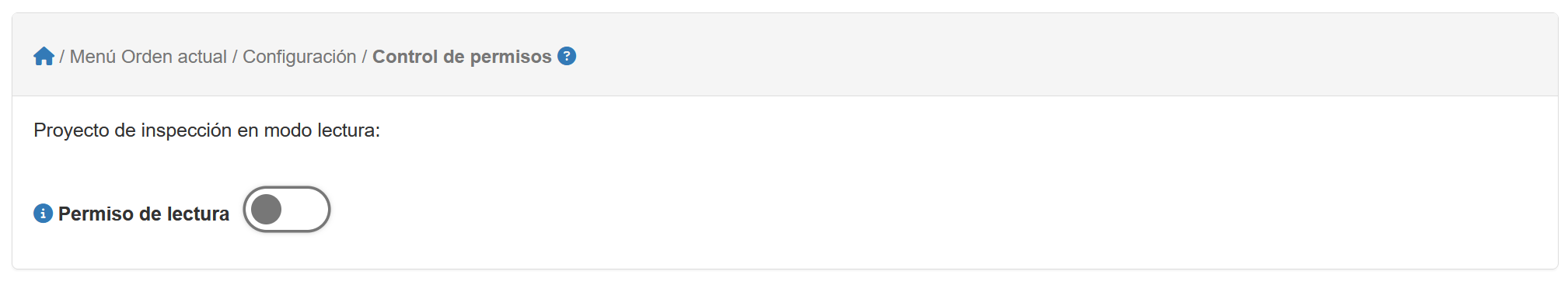 Menú Sistemas Empresas VirtualesMenú PrincipalInspeccionesPestaña Ordenes/Proyectos de InspecciónDetalle Orden/Proyecto Inspección seleccionadaMenú desplegable Especifico OrdenConfiguración Control de permisos Luego de haber seleccionado la opción de menú de Control de permisos de la opción Configuración de la orden, se tiene la siguiente figura. Fig 317 Extracto de Pantalla mostrando la opción para el control de permiso de una determinada orden.