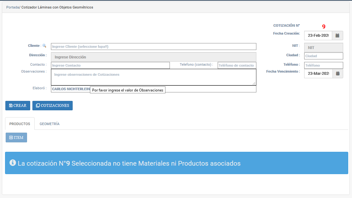 El cotizador es para metales conformado el módulo encargado de permitir la cotización de productos conformados. Este módulo posee muchas similitudes con el Cotizador convencional (ver Cotizador), sin embargo este se caracteriza porque permite cotizar por un lado Productos definidos en un Maestro de producto (convencional) y los Productos Conformados a partir de geometría, medidas y operaciones