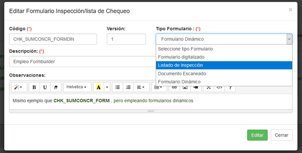 Familia de Inspección - PROGRAMACIÓN/ Checklist/crear-Modificar Formulario