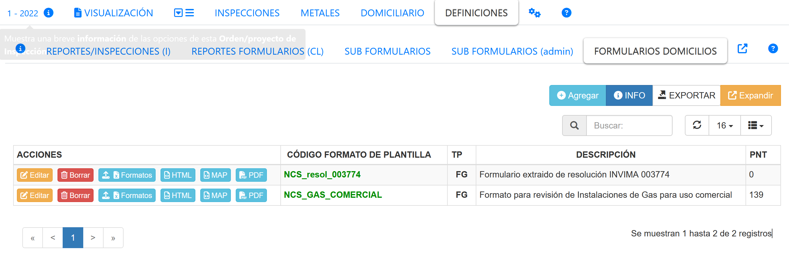 Permite exportar un listado de plantillas de formularios para inspección domiciliaria definidos.