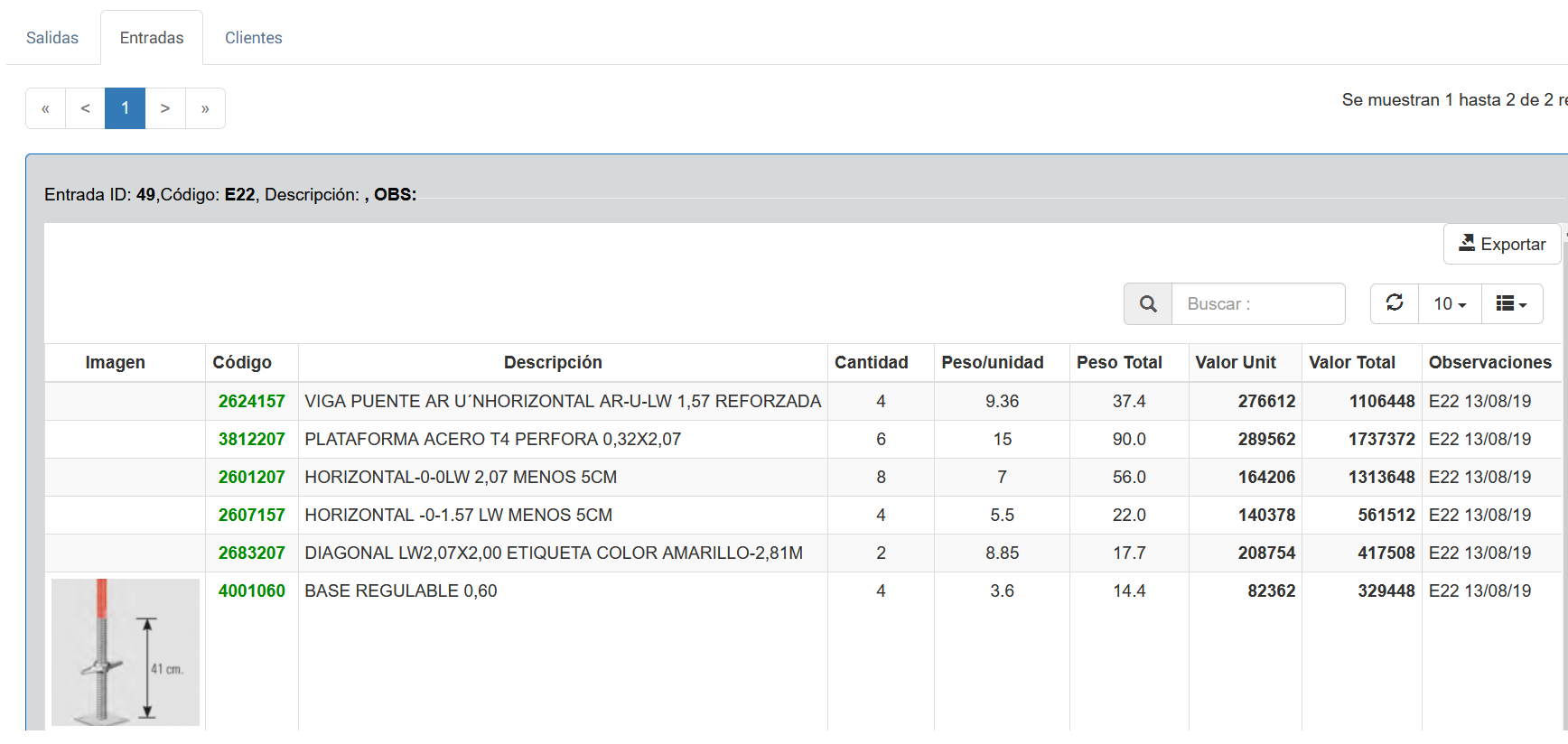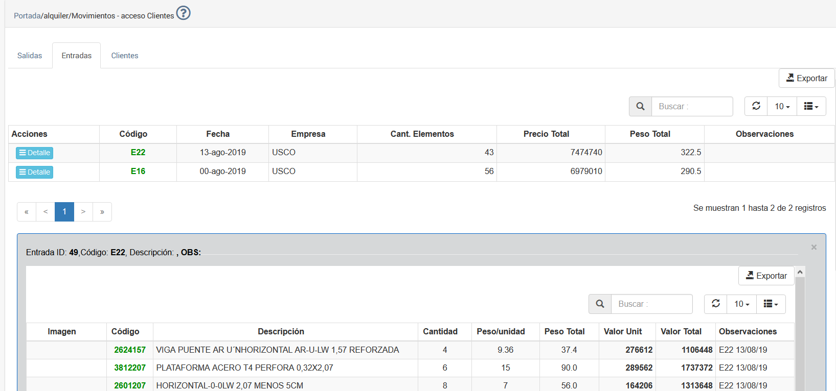 Al seleccionar la orden el detalle de una de Entrada se muestra una pantalla con el detalle de productos a alquilar, tal como se muestra a continuación