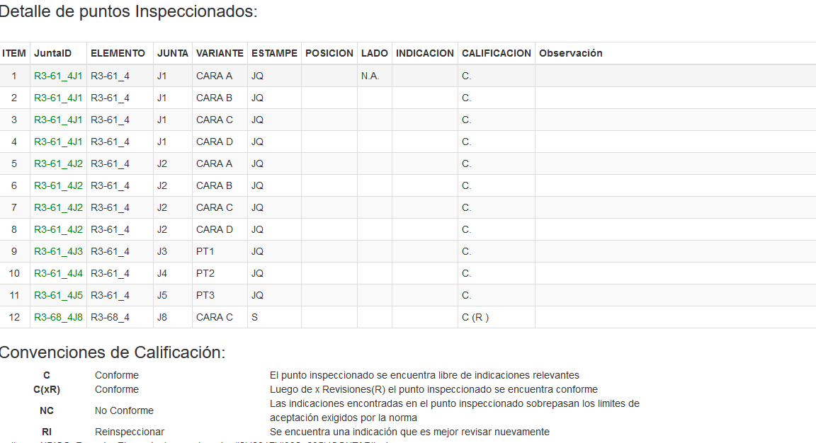 Fig 321 Extracto de Pantalla mostrando el detalle puntos inspeccionados del Reporte seleccionado.