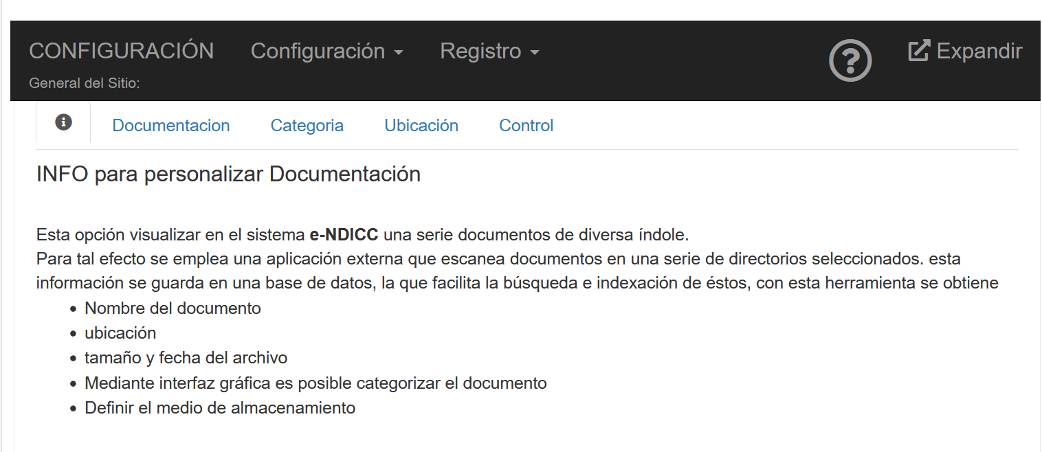 •Documentación: Permite visualizar y definir listado de documentación indexada en sistema, muy util para clasificar documentación digital. Más detalles, ver Pestaña Documentación