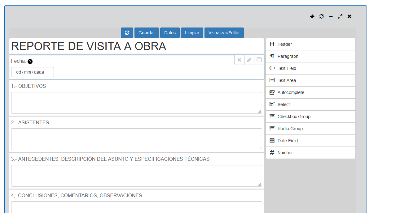 Al presionar el botón "Cargar (diseño)". se procede a cargar los datos de éste formulario en la ventana, el editor de Formbuilder y los botones de acción cambian de acuerdo a la siguiente imagen.