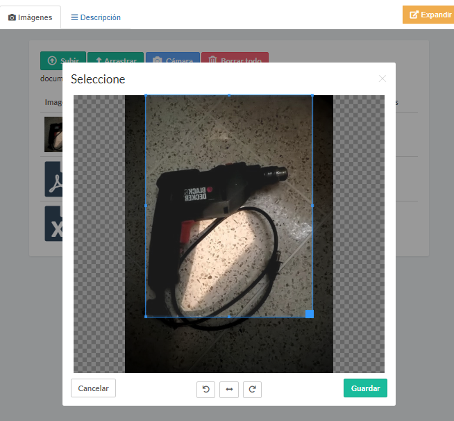 SELECción Recortar: Se puede "recortar" la imagen captada con la cámara con objeto de filtrar el contenido, para tal efecto en la imagen hay un rectángulo que se puede seleccionar, permitiendo ajustar el tamaño y posición de éste. Una vez que se seleccione guardar, se modificará la imagen para que contenga solamente el recuadro seleccionado y con ello el tamaño de la imagen