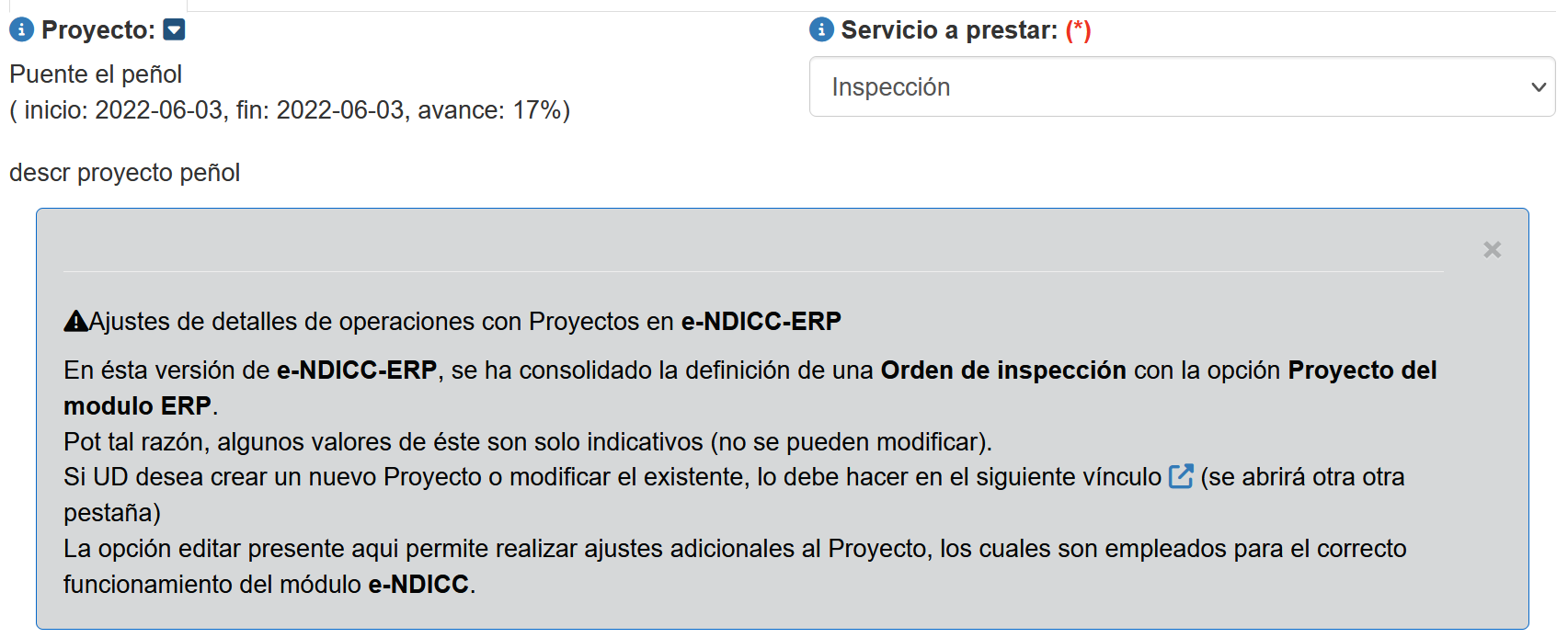 Las versiones de e-NDICC disponibles difieren un poco en como se define y maneja una Orden/proyecto de inspección, sin embargo una vez creada el manejo de toda la información que depende de el es para el usuario similar.