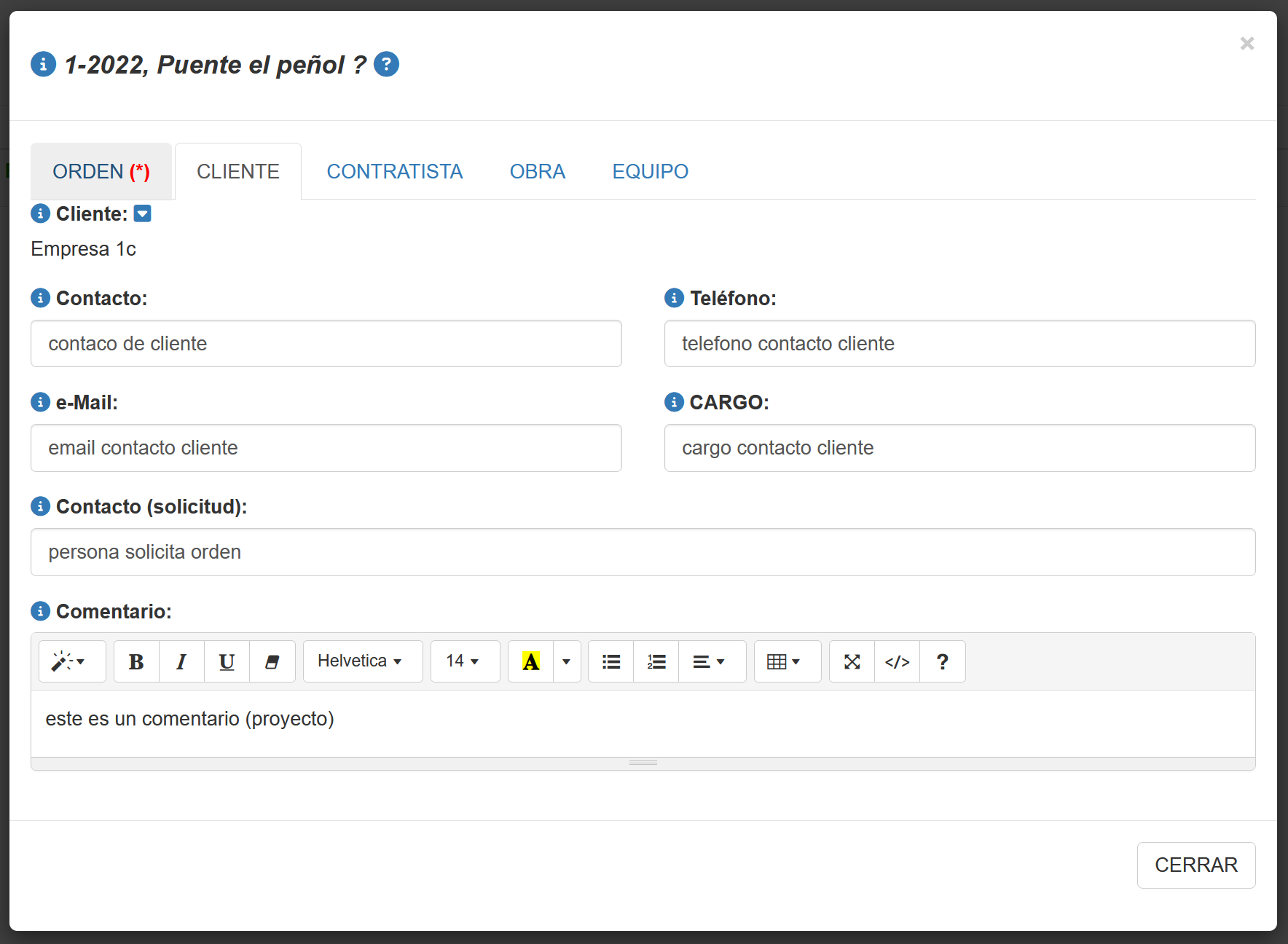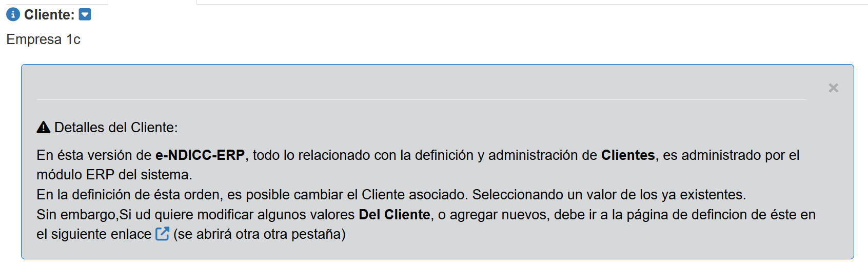 Muestra información adicional sobre el Cliente que el sistema e-NDICC-ERP guarda de la Orden/Proyecto de inspección.
