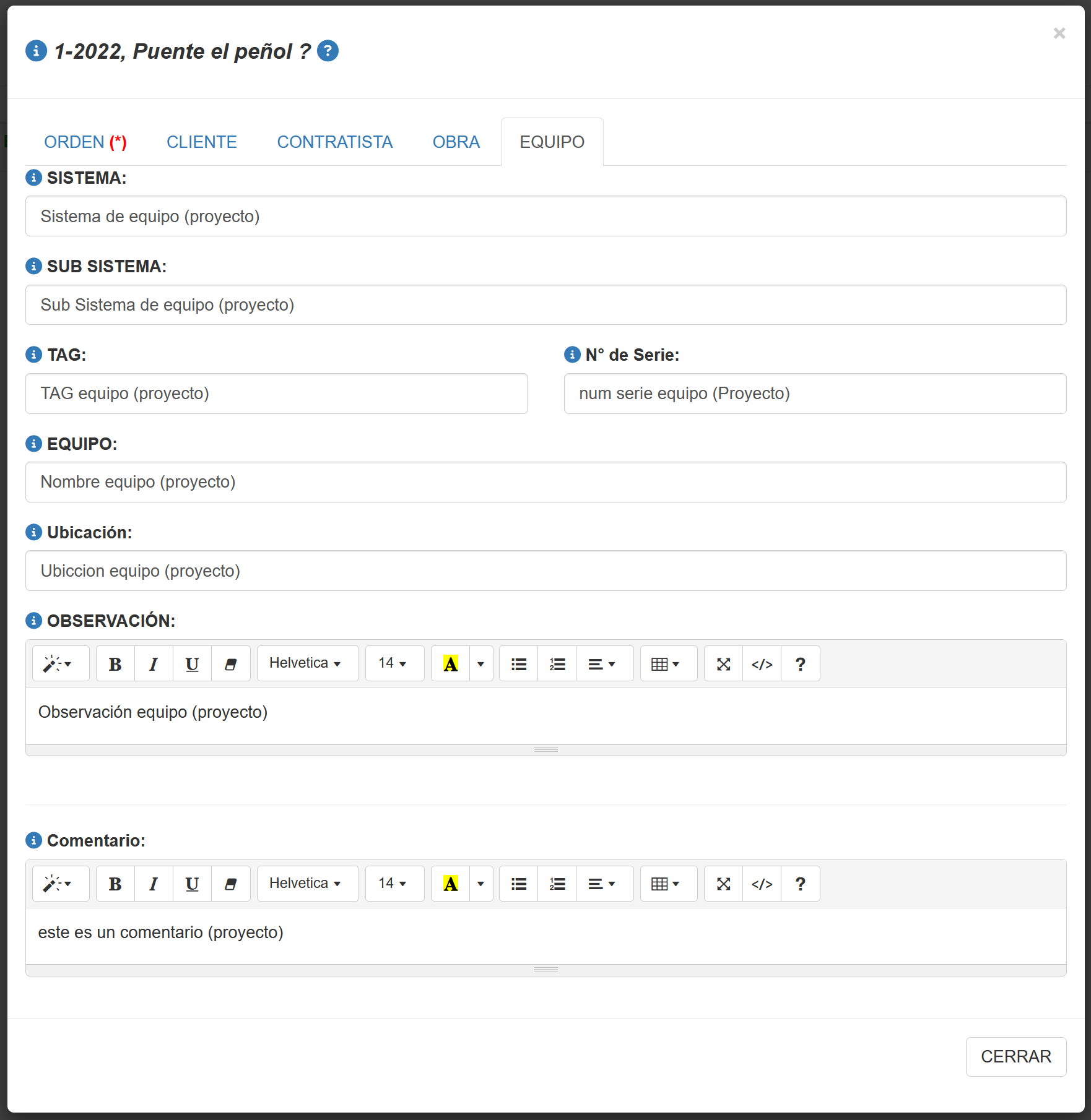 Fig 489 Ventana emergente para crear/editar una Orden/Proyecto de inspección, con pestaña EQUIPO activa..