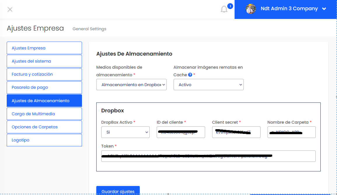 3.Ingresar los valores en la opción de configuración de la empresa, pestaña ajustes de almacenamiento. Esta opción solamente está disponible para el administrador del grupo.