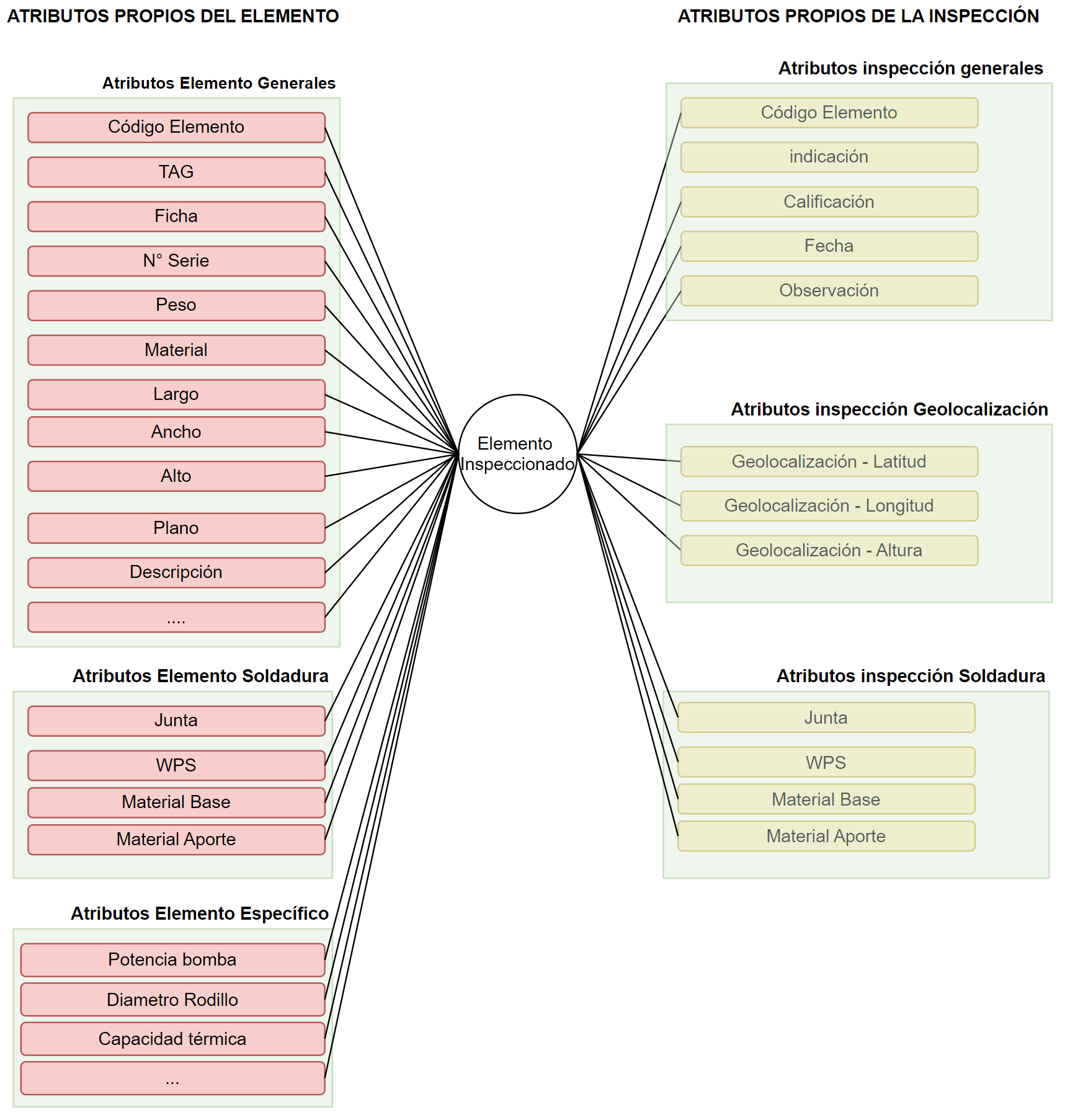 La figura anterior muestra que un elemento puede poseer un conjunto muy variado de atributos y algunos de los atributos asociados a la inspección.