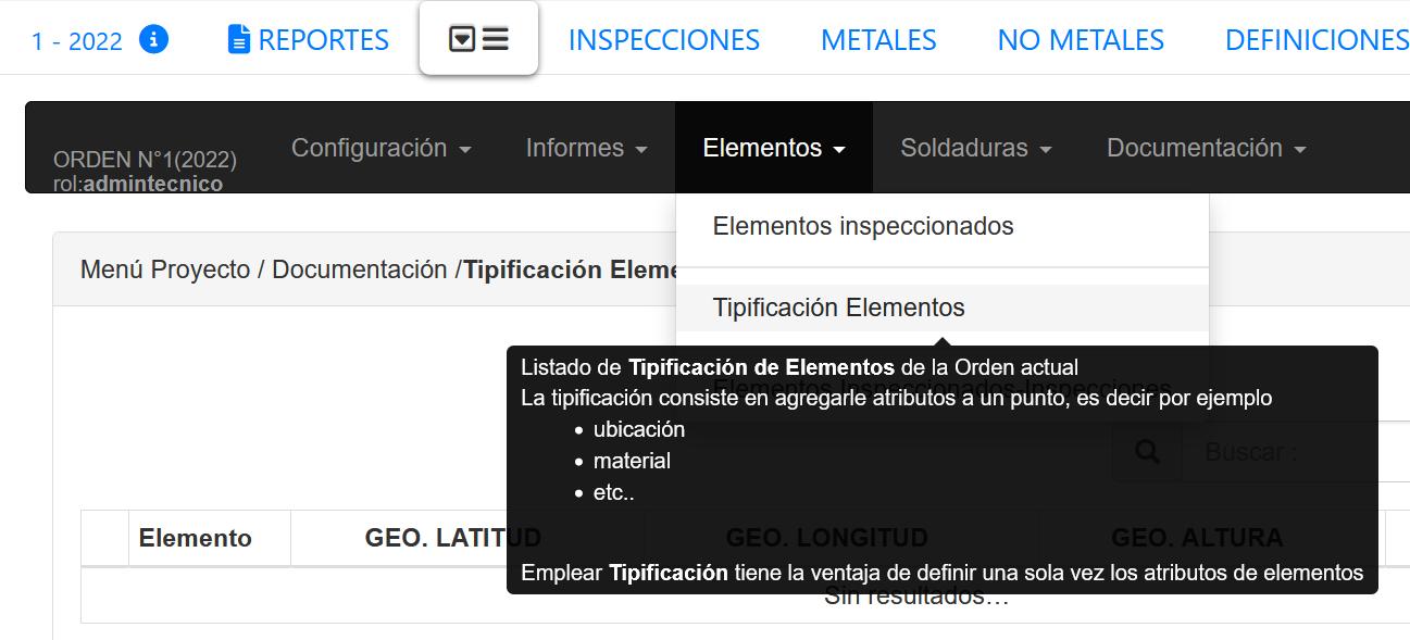 Aqui se podrá ver la lista de elementos tipificados de esta orden. Hay que destacar que esta lista está vacía (no se ha agregado tipificación). Por el solo hecho de agregar un elemento a la inspección, este se agregará a la lista de tipificación.