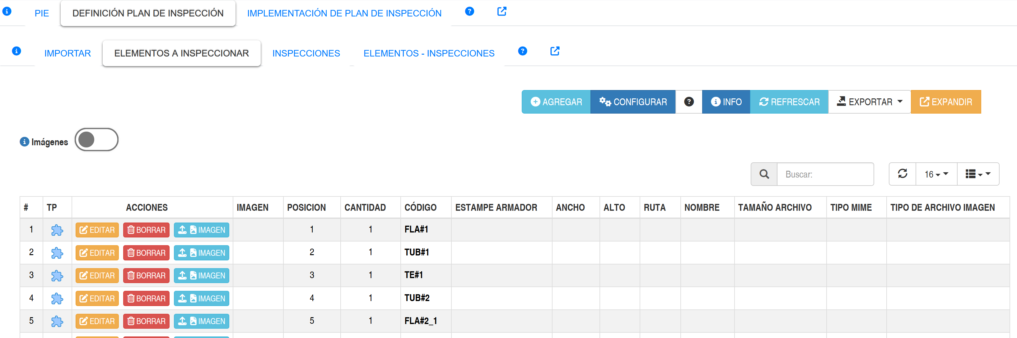 al seleccionar la pestaña ELEMENTOS A INSPECCIONAR de la opción DEFINICIÓN DE PLAN DE INSPECCIÓN se mostrará una pantalla que permitirá mostrar el listado de los elementos a inspeccionar, agregar /editar cada uno de estos, tal como se muestra en la siguiente imagen.