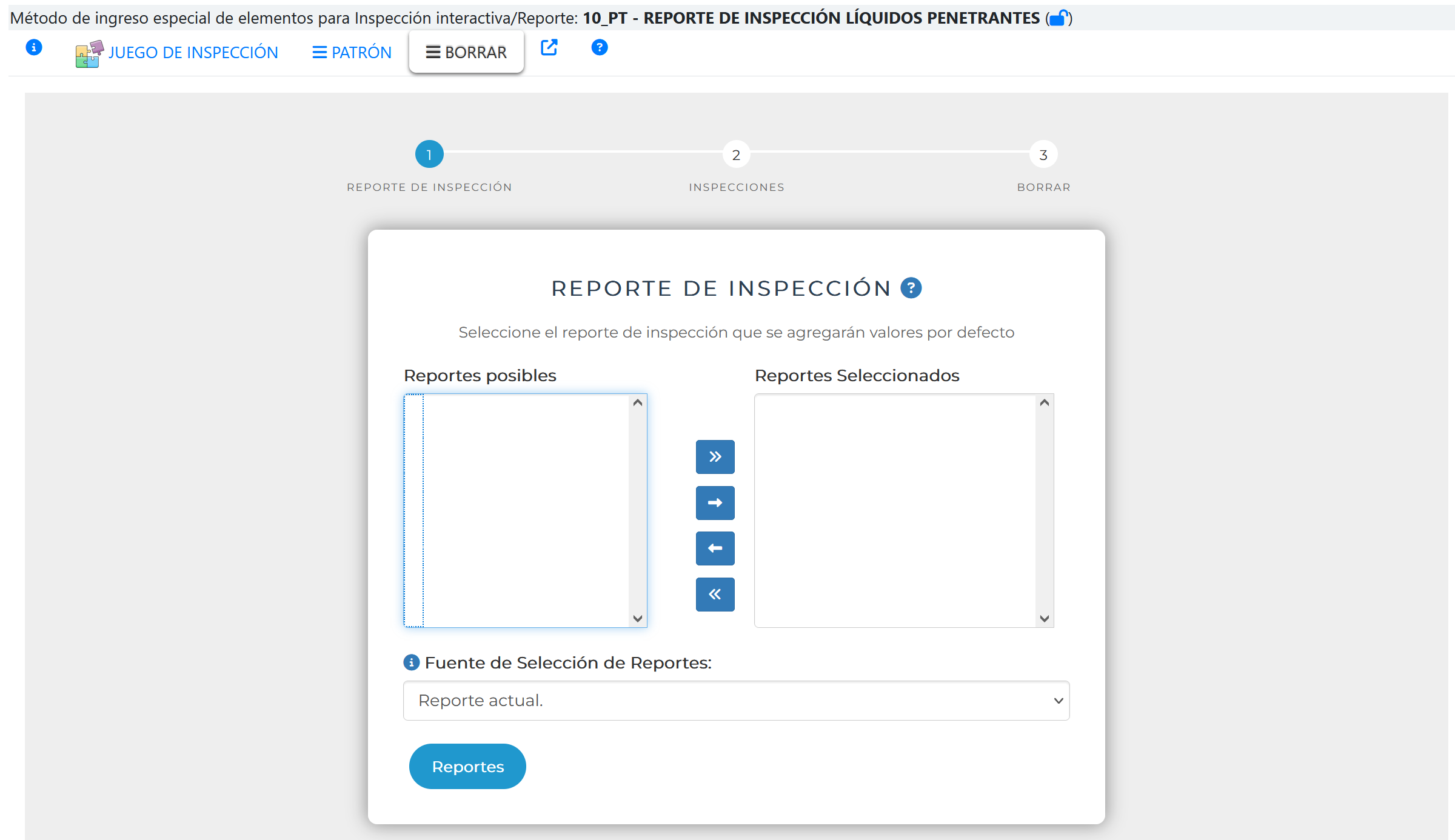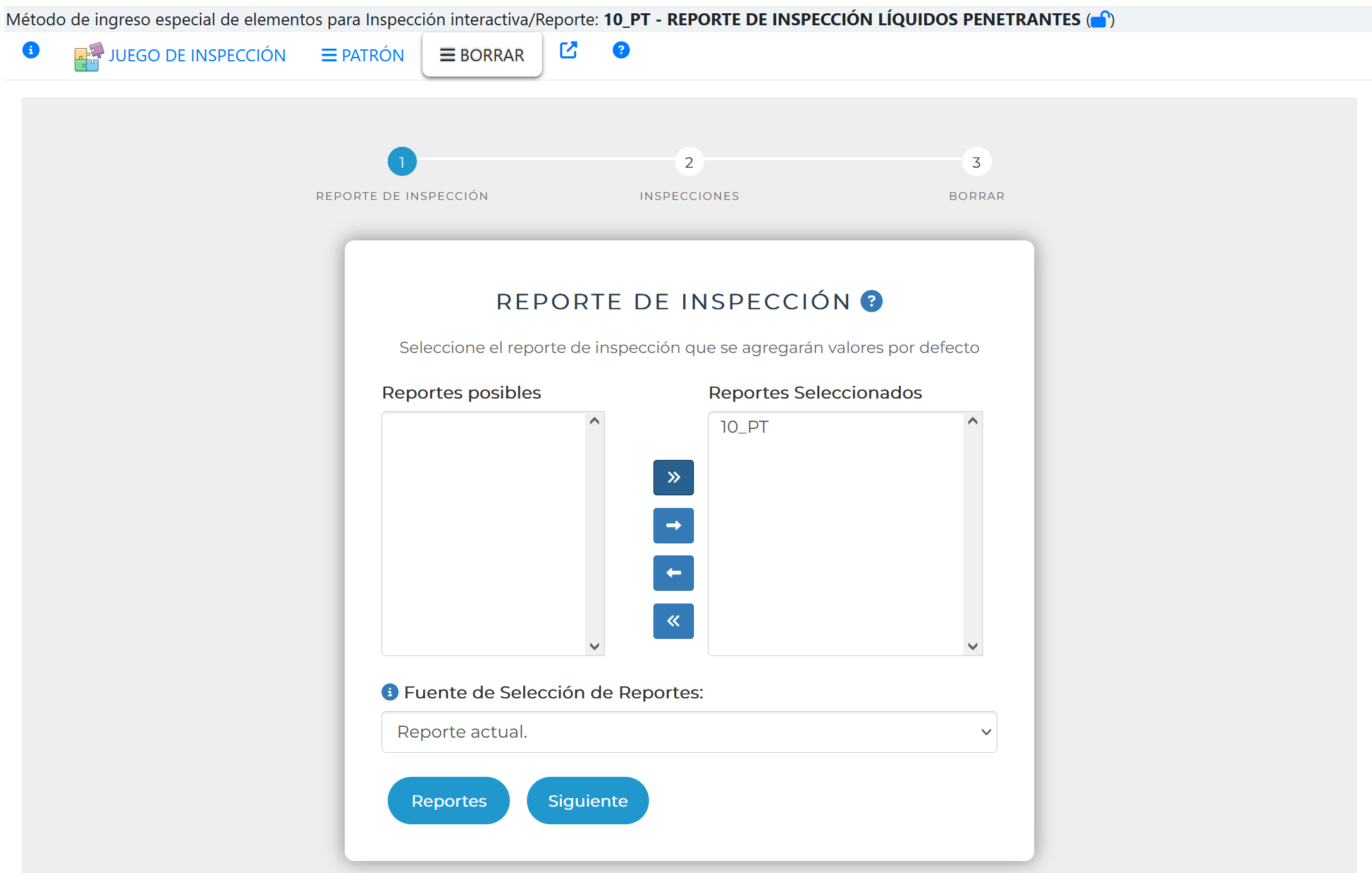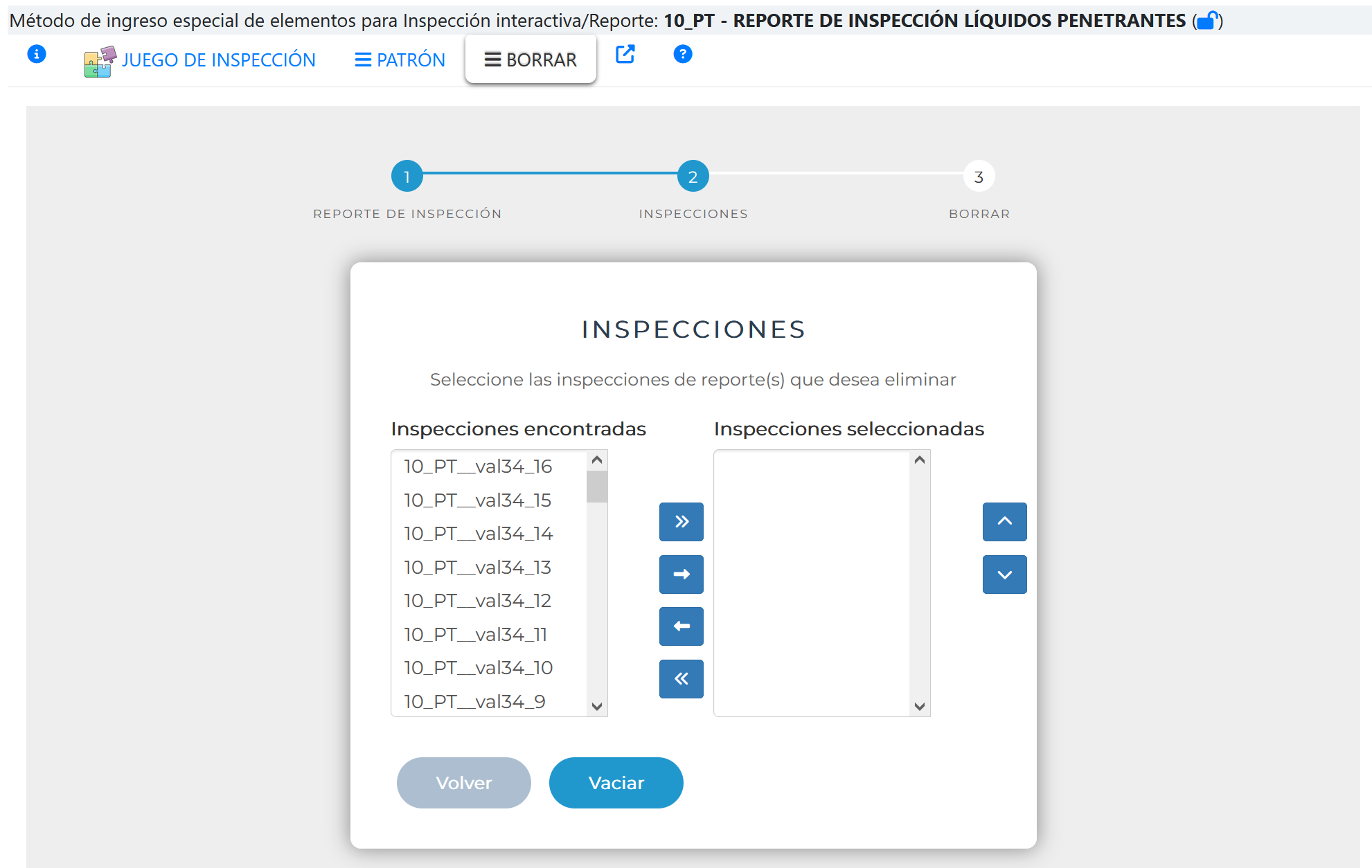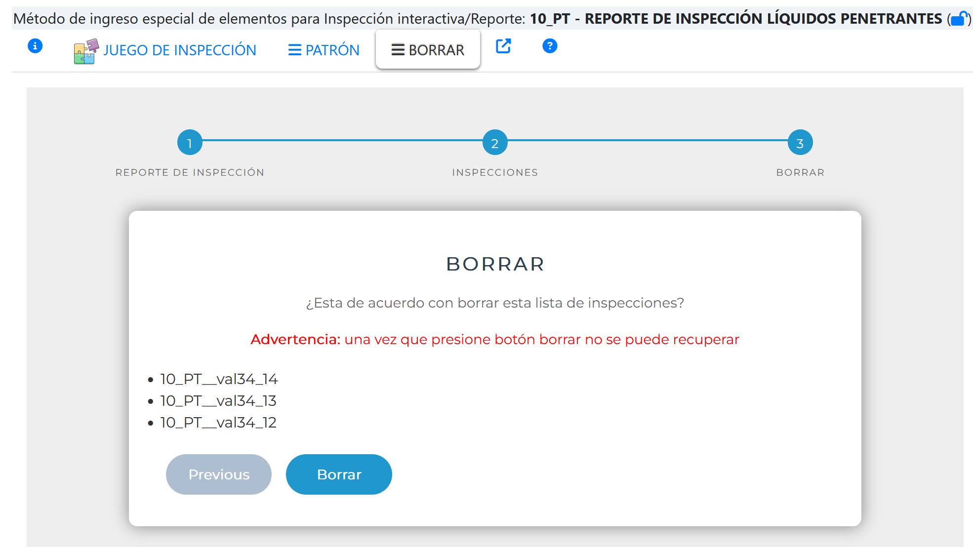 Al seleccionar la pestaña BORRAR se activa el asistente que permite el Ingreso de inspecciones empleando un patrón , tal como se muestra en la siguiente imagen.