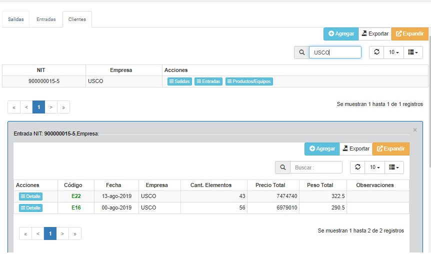 Detalle Permite visualizar el detalle de la orden de Entrada del cliente seleccionado. Más detalles ver Detalle de Orden de entrada de Producto