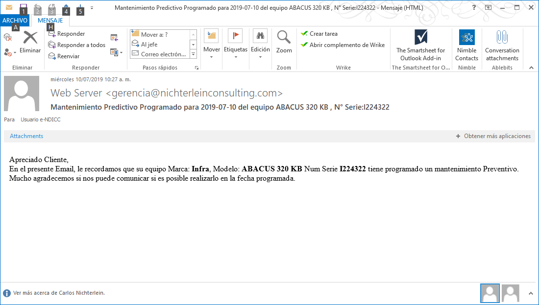 •Asunto Asunto del Correo electrónico, se indica datos del equipo y la fecha programada del evento.