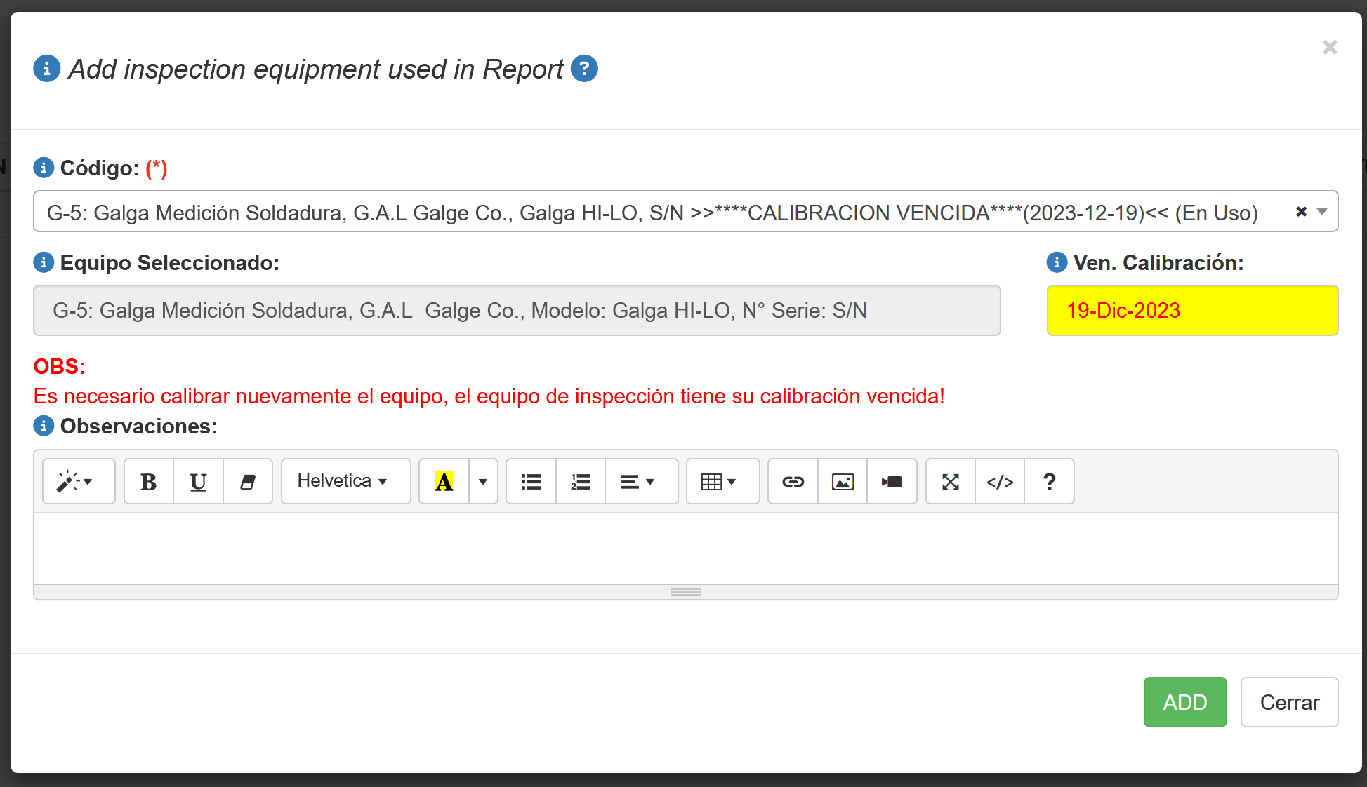 Al seleccionar un equipo, que tenga control de calibración y cuya calibración esté vencida, aparecerá un mensaje que le indique al inspector su condición pero el inspector podrá seleccionarlo, tal como se muestra en la siguiente imagen.