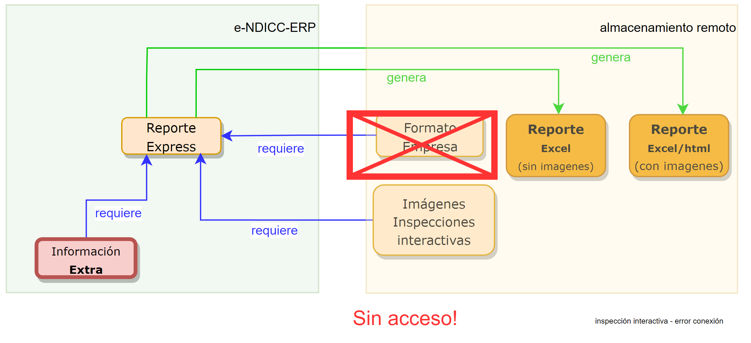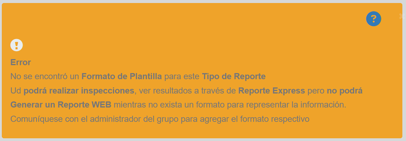 Este error se presenta porque el sistema e-NDICC-ERP NO tiene acceso al formato del Reporte de Inspección que se emplea como plantilla para el tipo de reporte seleccionado. Esta situación se presenta en la siguiente imagen