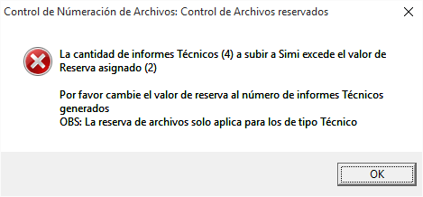 En caso de que la cantidad de informes a realizar sea mayor que la reserva aparecerá una ventana, tal como se muestra en la siguiente imagen
