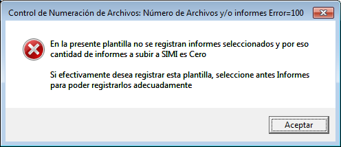 En caso de que se presione el botón e-NDICC y no se haya seleccionado algún informe a para registrar al sistema aparecerá un mensaje de error . Esto también se caracteriza porque en la hoja de datos el “Num. Total Archivos:” es cero tal como se muestra en la figura a continuación