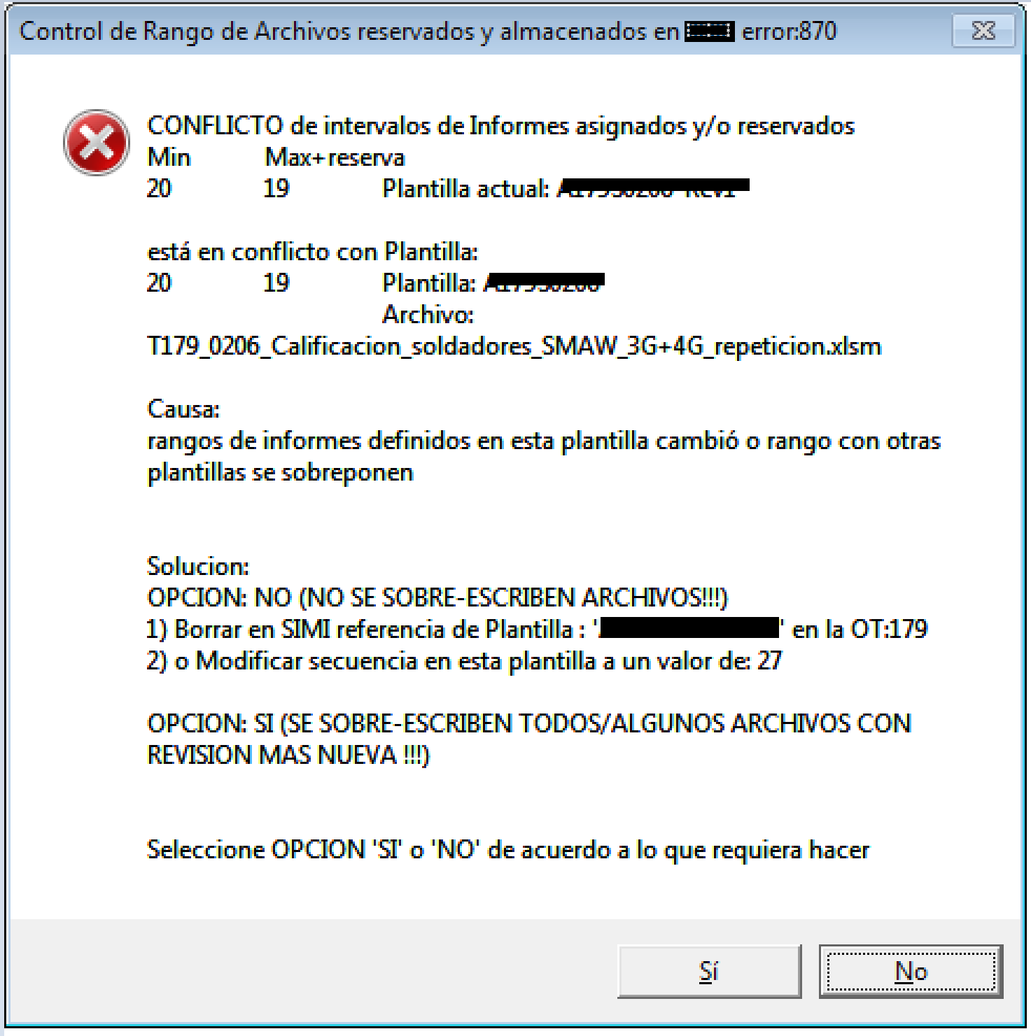 Al intentar inscribir una plantilla que tenga rango de informes que estén en ya en un rango de informes ya reservados el sistema arrojará la siguiente pantalla de error.