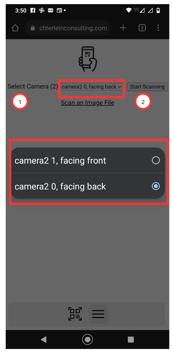 1.Se selecciona la camara , el programa detecta las cámaras disponibles del dispositivo y las enumera. Al seleccionarlas es posible continuar con el escaneo