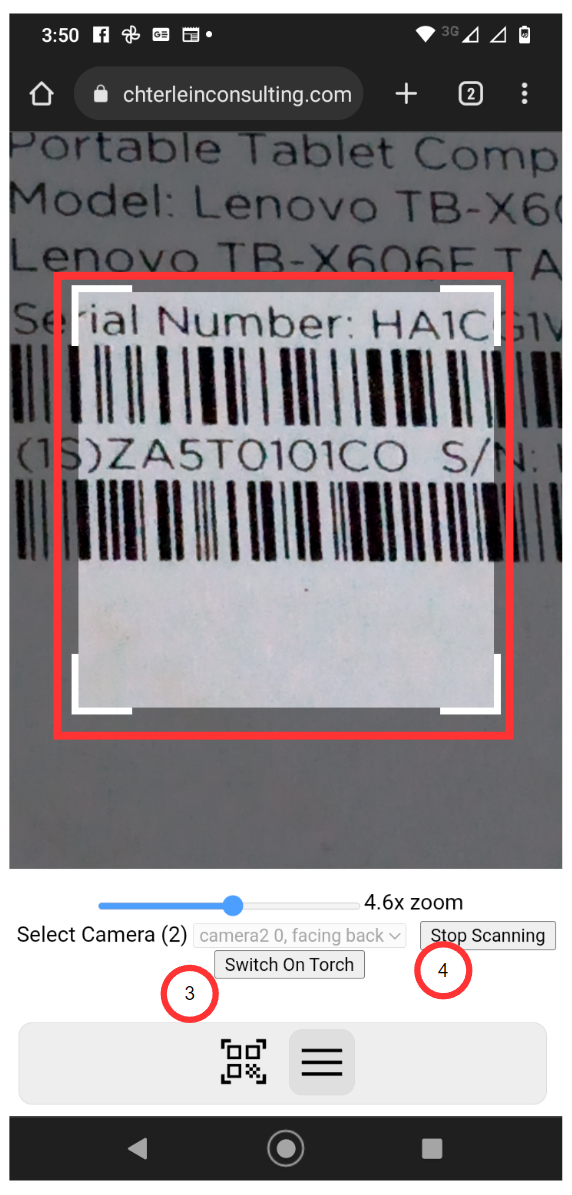 Fig 780 Extracto de pantallas de dispositivo movil (android) empleando escaner de código de Barras/QR