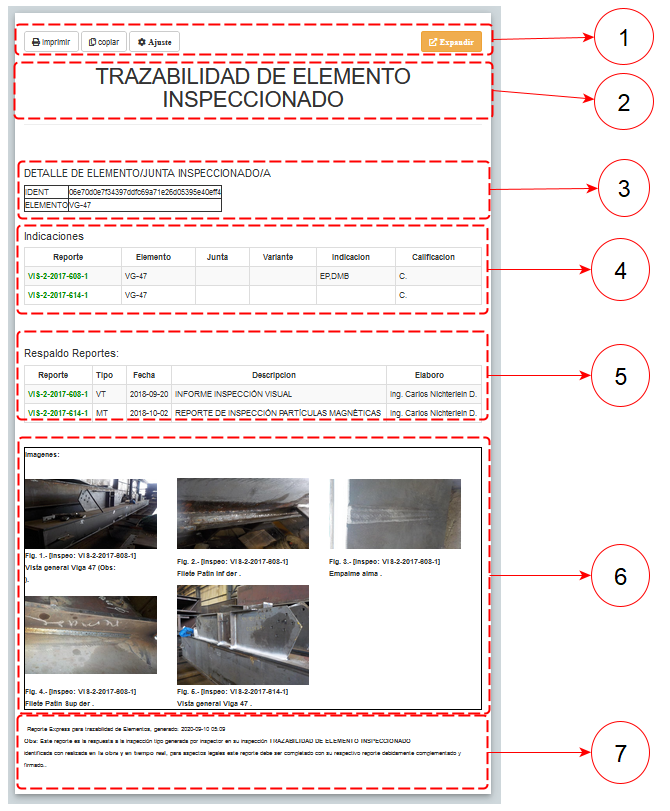 Fig 938 Estructura típica de un reporte de Trazabilidad de Elemento inspeccionado.