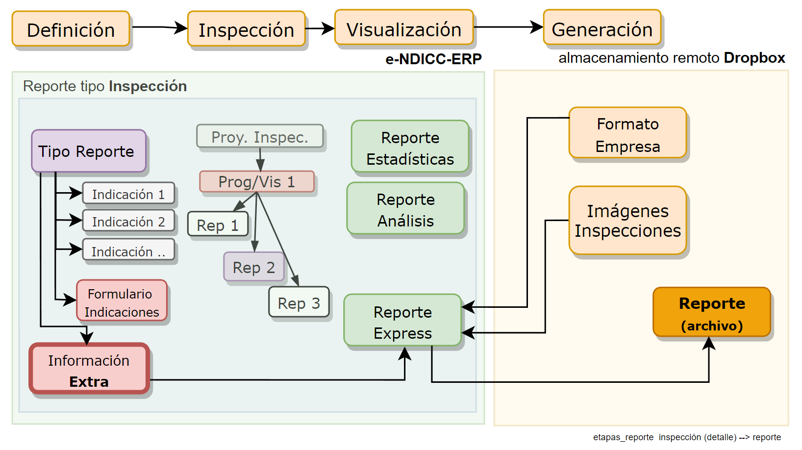 Permite la generación del reporte final en medio de almacenamiento remoto. Dependiendo de la naturaleza del Reporte, se tendrán actividades y métodos específicos: •Reportes tipo END requieren una información EXTRA (equipos empleados, insumos, información específica del reporte, información procedimientos de inspección, información costos etc, ver Información Extra •Formatos propios de empresa, Se usa el mismo formato y se procede a reflejar el contenido de las inspecciones en ellos •Eventualmente se incorporarán imágenes en el. |