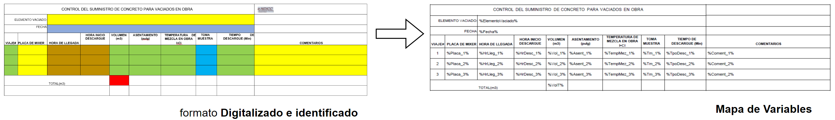 Cada campo previamente definido (identificado con colores), debe identificarse con una variable. Esto permitirá: