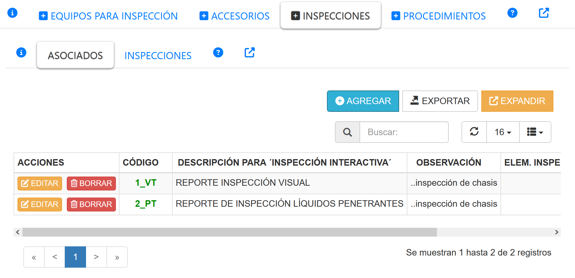 Al seleccionar la opción ASOCIADOS, se mostrará una opción que permite asociar un reporte de inspección END al reporte. Los reportes asociados, se mostrarán como un listado de reportes del tipo END, tal como se muestra en la imagen a continuación