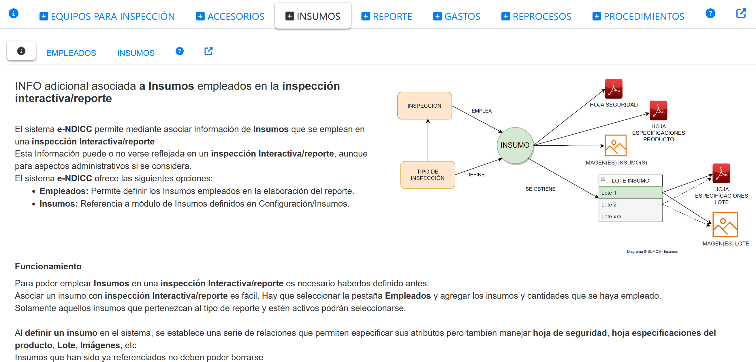 Permite asociar un insumo previamente definido en el sistema con el reporte de inspección. de los reportes que contiene esta orden. Mayores detalles, ver Equipo Empleado |