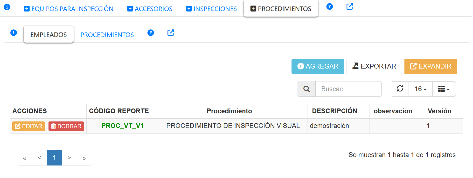 Al seleccionar la opción EMPLEADOS, se mostrará una opción que permite asociar un Procedimiento de inspección al reporte. Los Procedimientos de inspección asociados, se mostrarán como un listado de procedimientos, tal como se muestra en la imagen a continuación