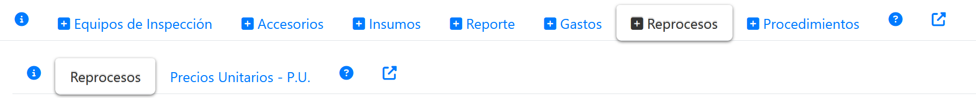 Fig 1230 Detalle de opciones (pestañas en segundo nivel) luego de haber seleccionado la pestaña de extras "Reproceso".