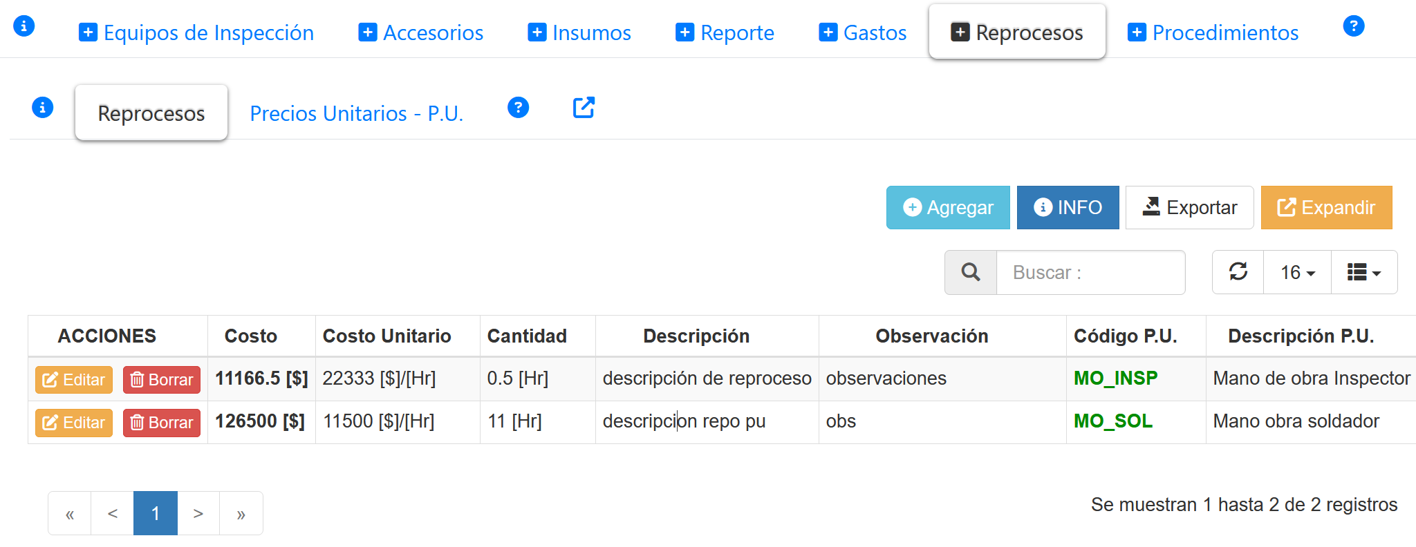 Fig 1232 Listado de Costos de Reproceso asociados al Reporte de inspección.