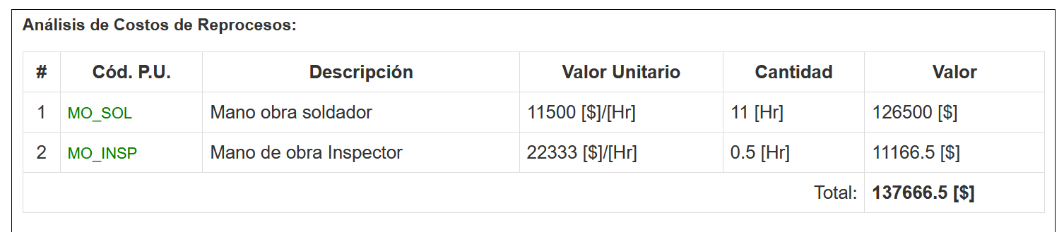 Con la información ingresada es posible calcular el Costo de Reproceso, teniendo en cuenta lo siguiente