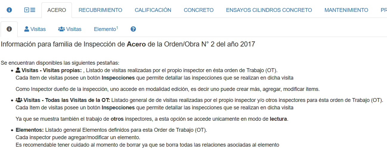 El contenido de la pestaña INFO contiene una breve información de las opciones disponibles en éste nivel. Es la opción por defecto. Junto con mostrar la familia de inspección "ACERO" , muestra la Orden actual, tal como se muestra en la siguiente imagen.
