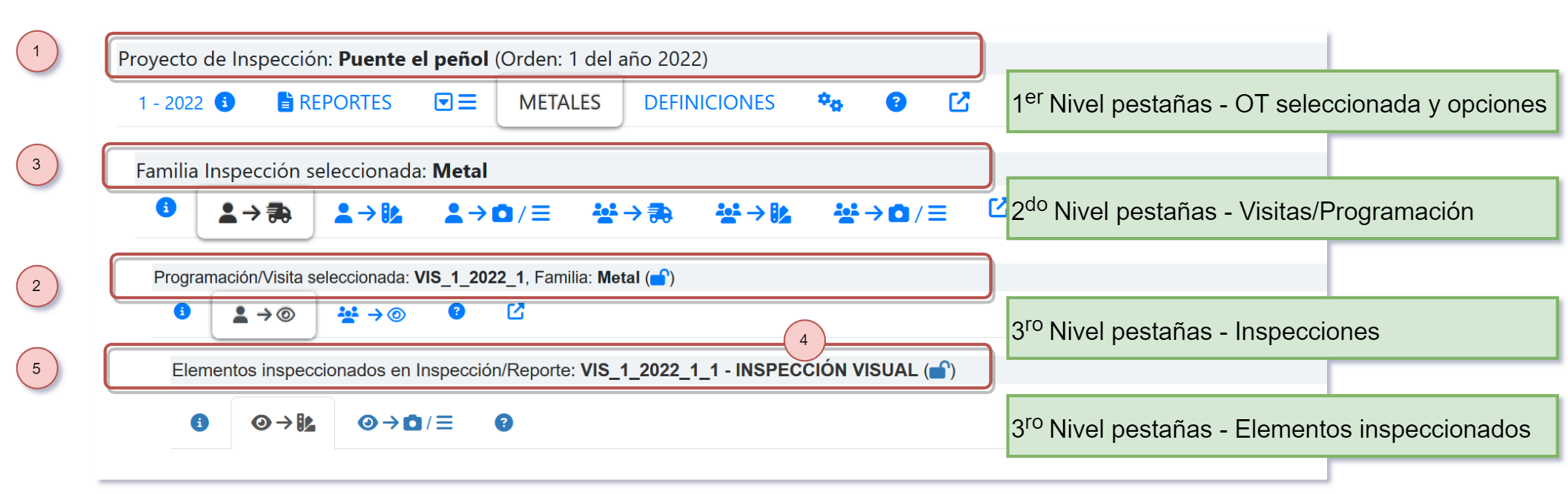 De la imagen anterior, se aprecian varios niveles ( Visitas 🠊 Inspecciones 🠊 Elementos). se ha creado una interfaz que permita varios niveles. Estos niveles se hace por medio de pestañas de diversos Niveles. Desde donde estoy ubicado se puede seleccionar todas las pestañas superiores, las laterales (mismo nivel) y todas las dependientes de ese nivel. las cuales cambian de acuerdo a la opción seleccionada.