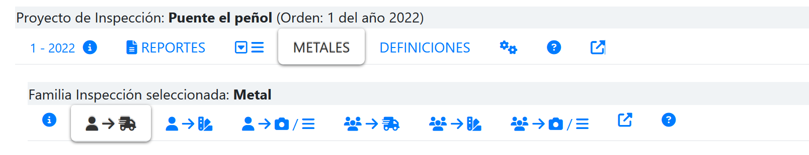 Al seleccionar la PESTAÑA Metales, se mostrará una segundo nivel de PESTAÑAS que muestra la opciones que tiene esta familia de inspecciones, tal como se muestra en la siguiente imagen