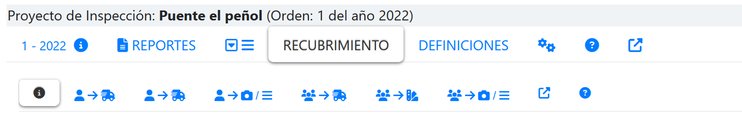 Al seleccionar la pestaña RECUBRIMIENTO, se mostrará una segundo nivel de PESTAÑAS que muestra la opciones que tiene esta familia de inspecciones, tal como se muestra en la siguiente imagen