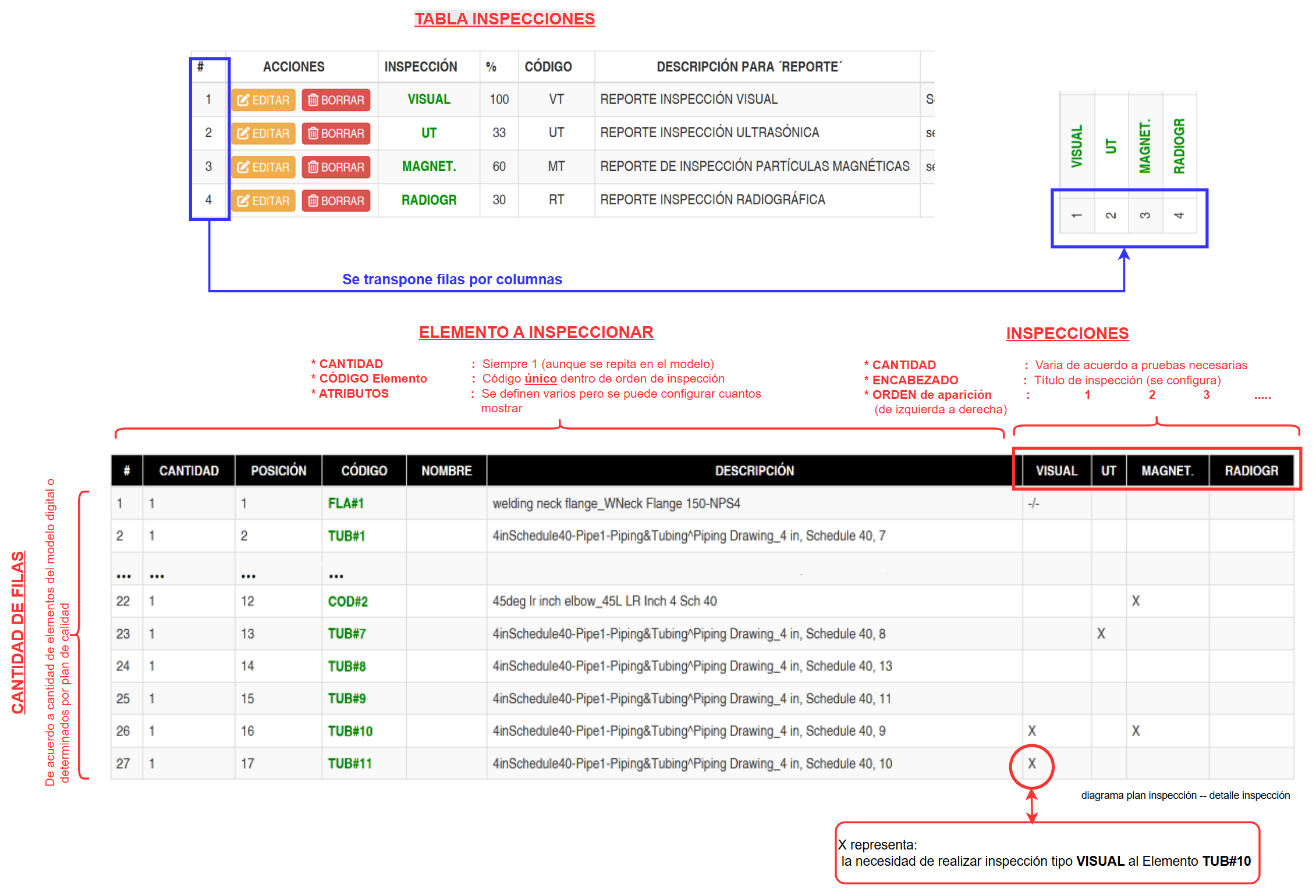 •Un listado de los elementos a inspeccionar que proviene de una lista de materiales especialmente condicionada para inspecciones, en donde se identifique cada elemento aun cuando se repita en una lista de materiales