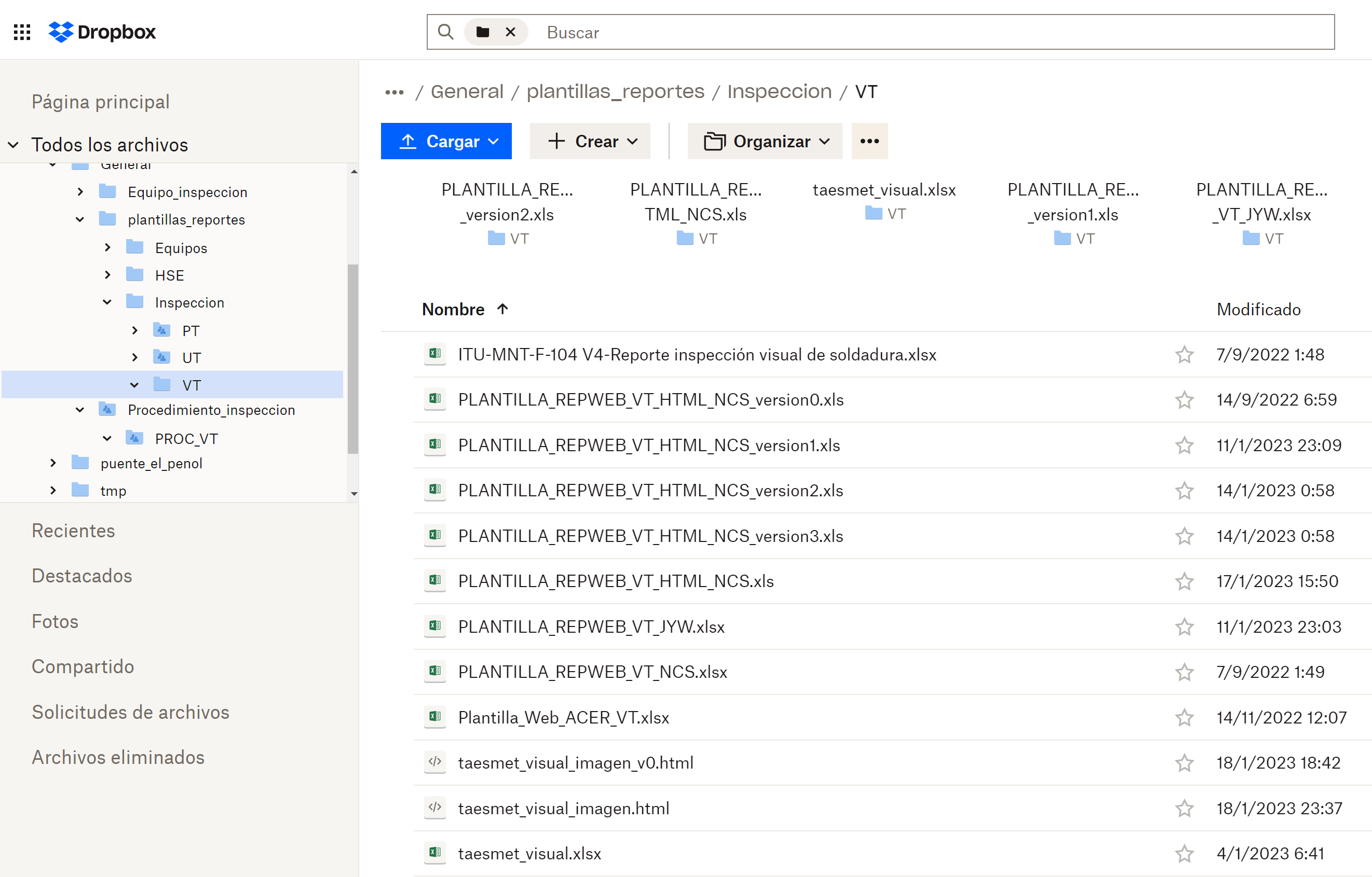 Fig 683 Extracto de pantalla formatos de plantillas para reporte tipo Inspección Visual VT en cuenta de dropbox asociada.