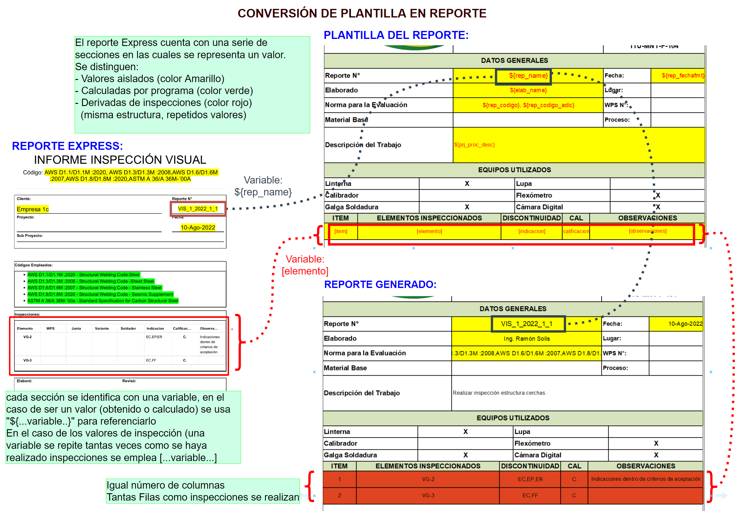 El formato del Reporte en EXCEL preparado, con todas las variables asignadas tendrá una información adicional de las variables en una distribución arbitraria de ubicación en el archivo, colores, formatos. Esta distribución forma una especie de Mapa de Variables la cual nos permite adaptarnos a cualquier tipo de Reporte.