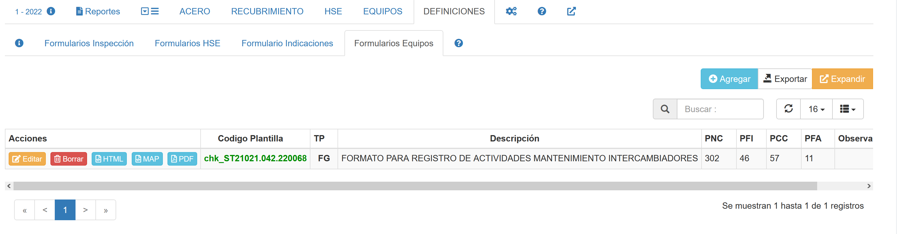 Al seleccionar la pestaña Formularios Equipos, se muestra un listado de formularios empleados en el la inspección de equipos,tal como se muestra en la siguiente imagen.