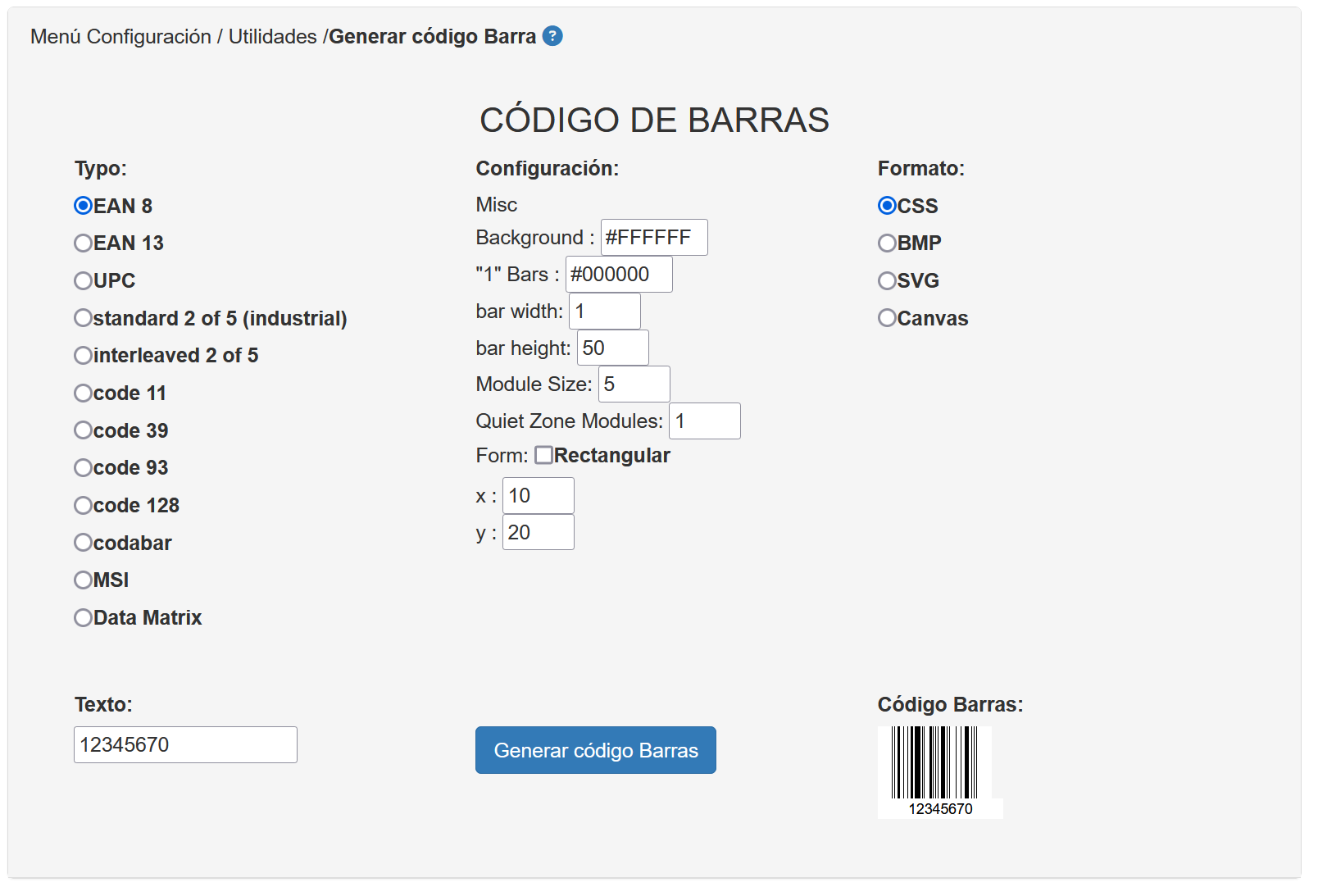 Menú Herramientas/Menú Configuración/Opción Utilidades/Generador códigos de barra