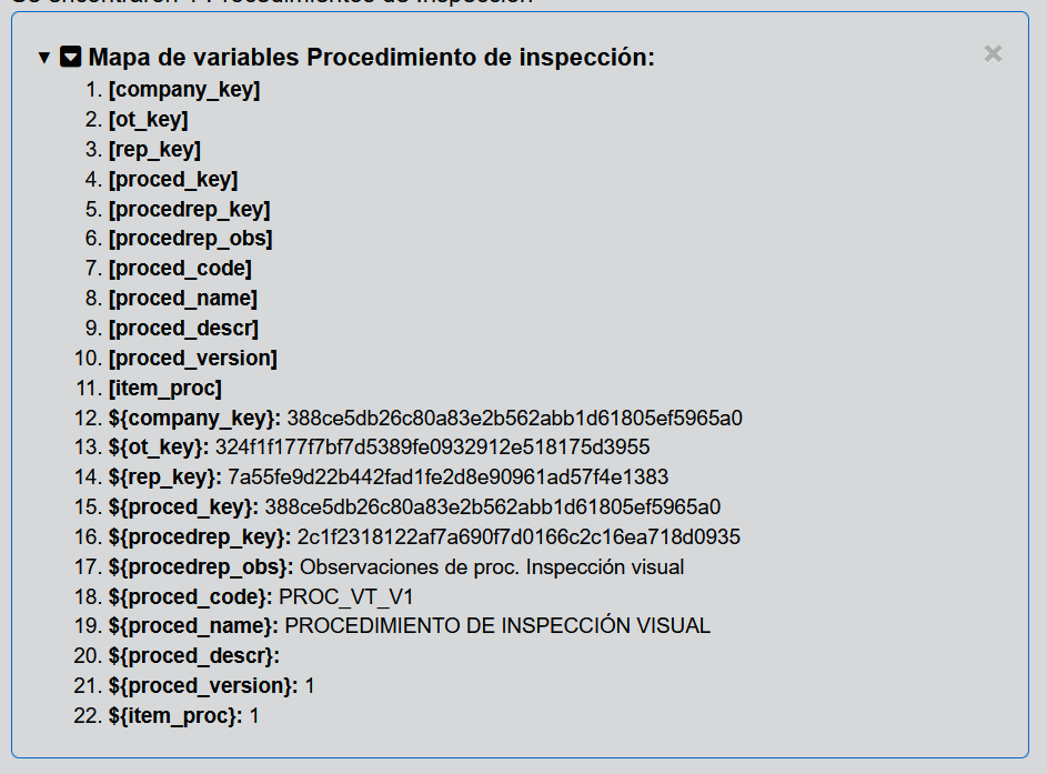 Fig 958 Extracto de pantalla, describiendo las variables del procedimiento de inspección.