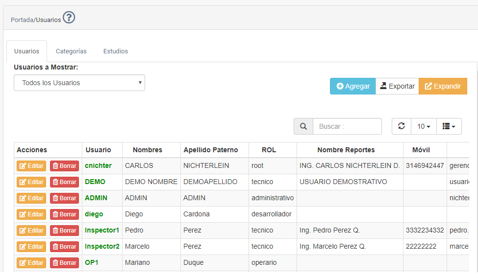 Usuario Nombre de usuario por el cual será identificado en el sistema. En la tabla de datos se muestra en color verde.